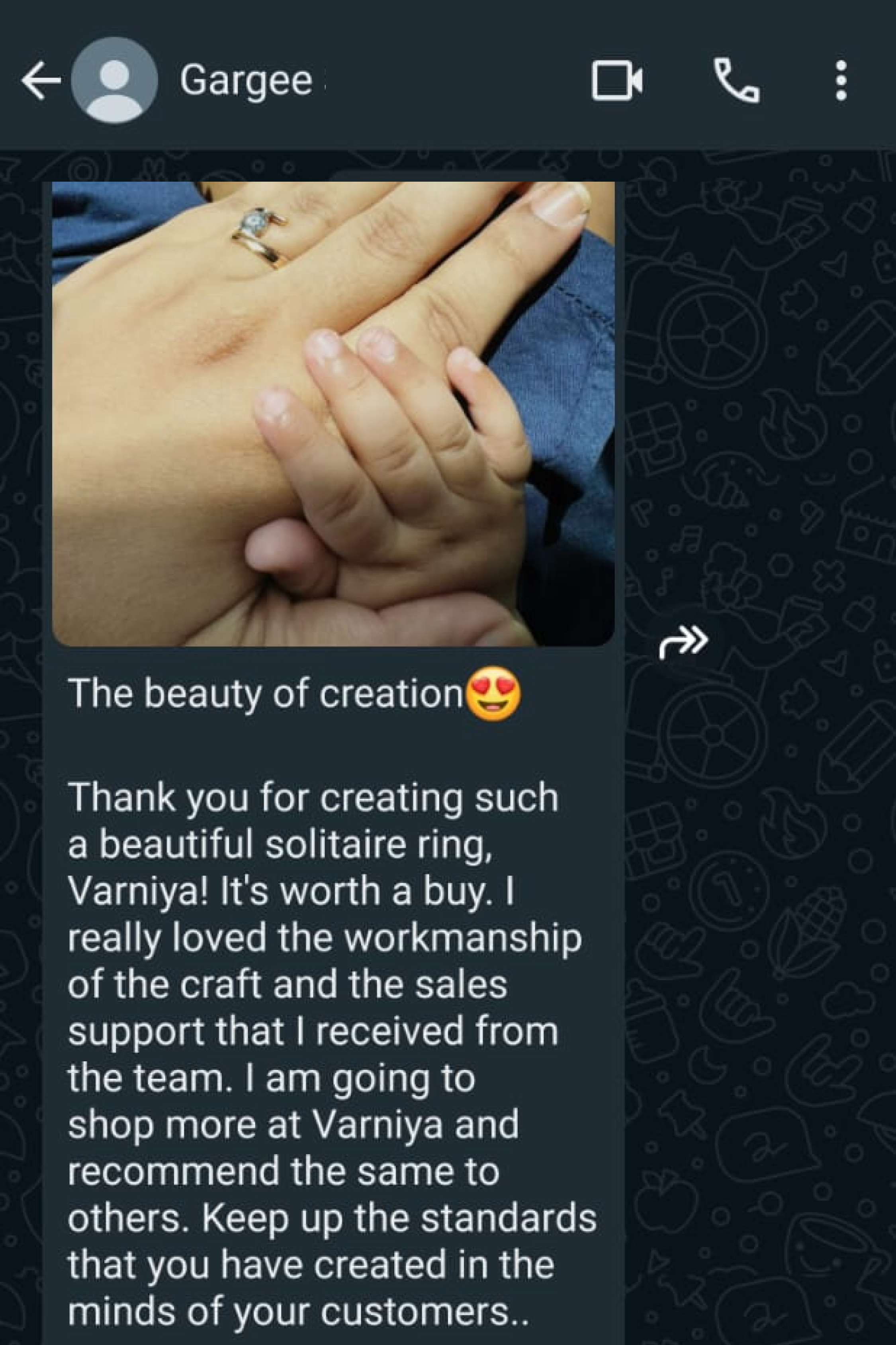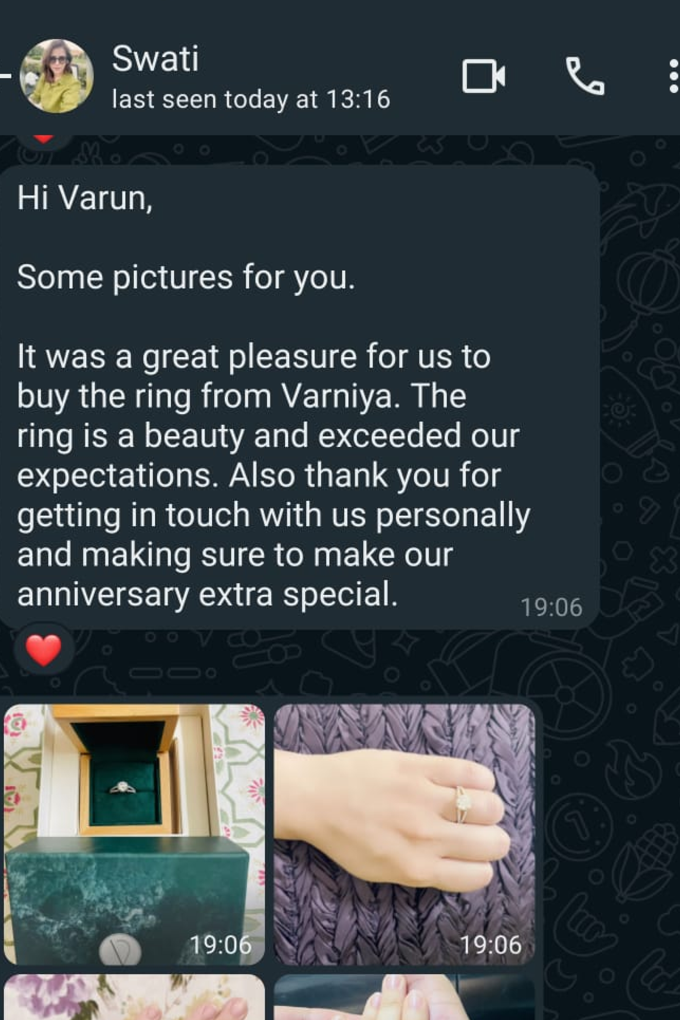 Varun and team offered the best options to suit my budget. Resolved all my apprehensions to make a lab grown diamond purchase. The order I placed came out so amazing that I placed another order right away!